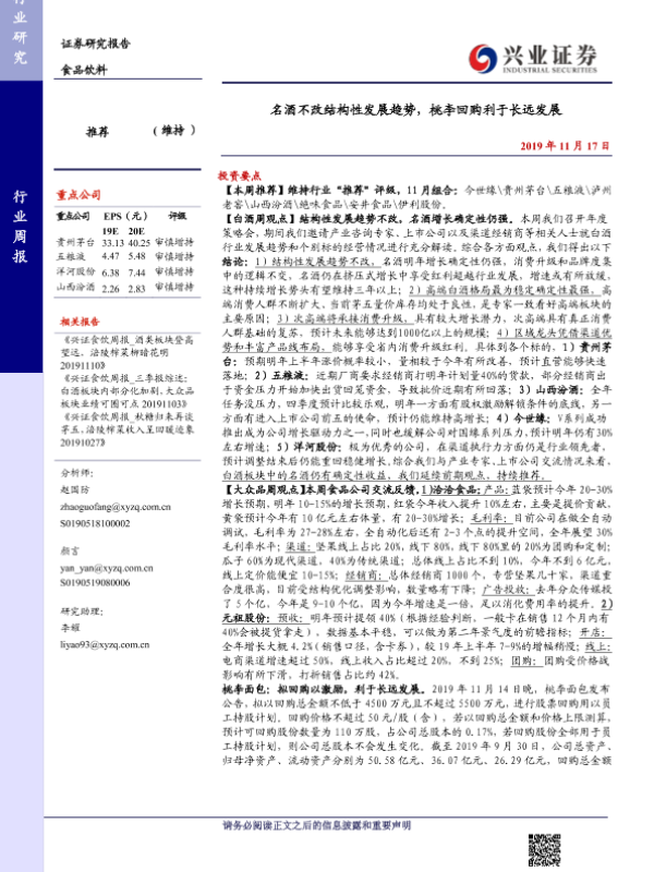 【兴业证券】【20191117】20191117-兴业证券-食品饮料行业周报:名酒不改结构性发展趋势,桃李回购利于长远发展-17页 行业研究