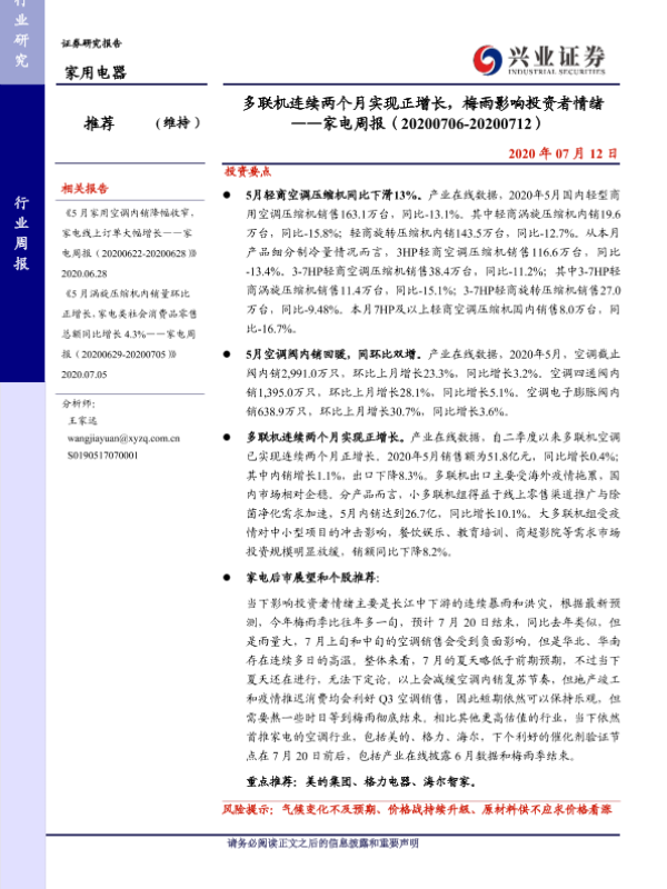 【兴业证券】【20200712】多联机连续两个月实现正增长,梅雨影响投资者情绪 ——家电周报(20200706-20200712)-8页 行业研究