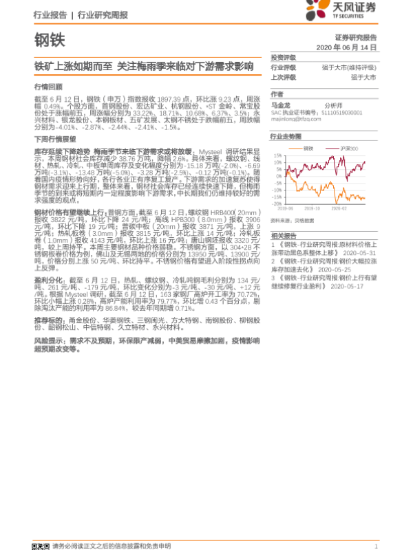 【天风证券】【20200614】20200614-天风证券-钢铁行业研究周报:铁矿上涨如期而至 关注梅雨季来临对下游需求影响-13页 行业研究