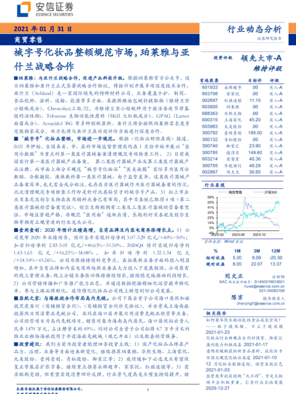 【安信证券】【20210131】商贸零售:械字号化妆品整顿规范市场,珀莱雅与亚什兰战略合作-15页 行业研究