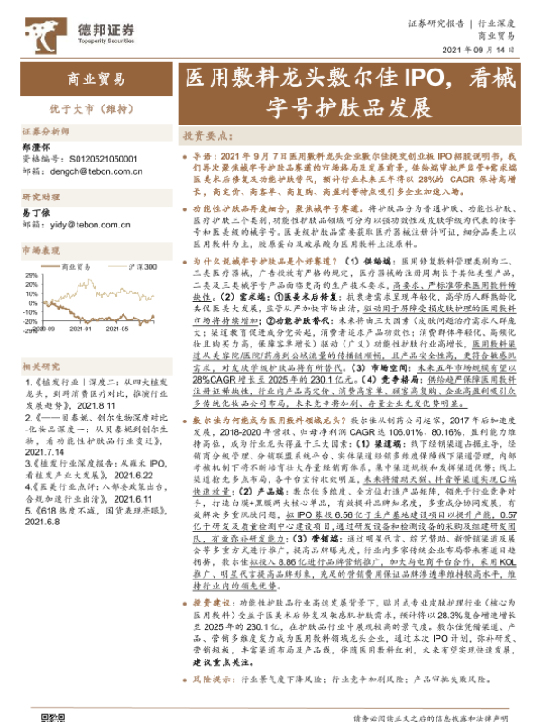 【德邦证券】【20210914】商业贸易行业:医用敷料龙头敷尔佳IPO,看械字号护肤品发展-30页 行业研究