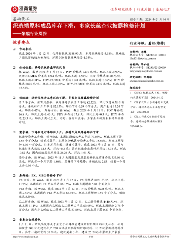 【浙商证券】【20240114】20240114-浙商证券-聚酯行业周报:织造端原料成品库存下滑,多家长丝企业披露检修计划-16页 行业研究