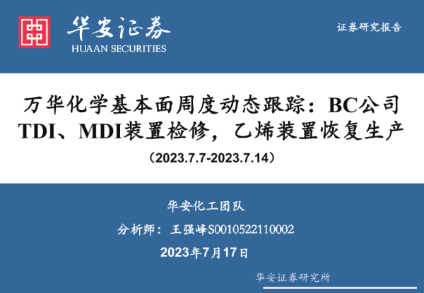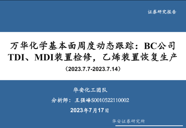 【华安证券】【20230717】20230717-华安证券-万华化学基本面周度动态跟踪:BC公司TDI、MDI装置检修,乙烯装置恢复生产-32页 行业研究
