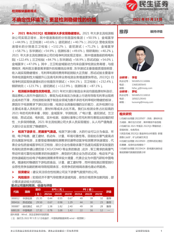 【民生证券】【20220513】检测板块最新观点:不确定性环境下,更显检测稳健性的价值-17页 行业研究