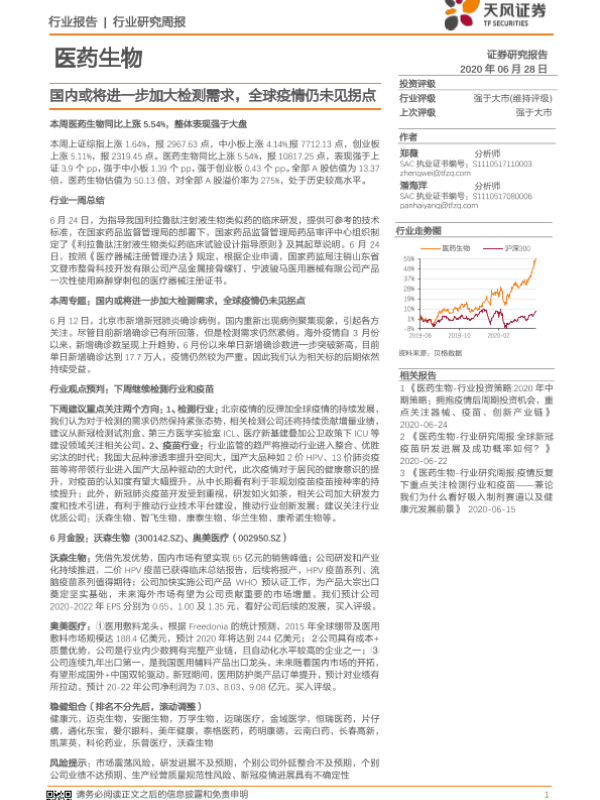 【天风证券】【20200628】医药生物行业研究周报:国内或将进一步加大检测需求,全球疫情仍未见拐点-18页 行业研究