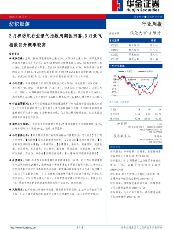 【华金证券】【20190407】20190407-华金证券-纺织服装行业周报:2月棉纺织行业景气指数周期性回落,3月景气指数回升概率较高-18页 行业研究