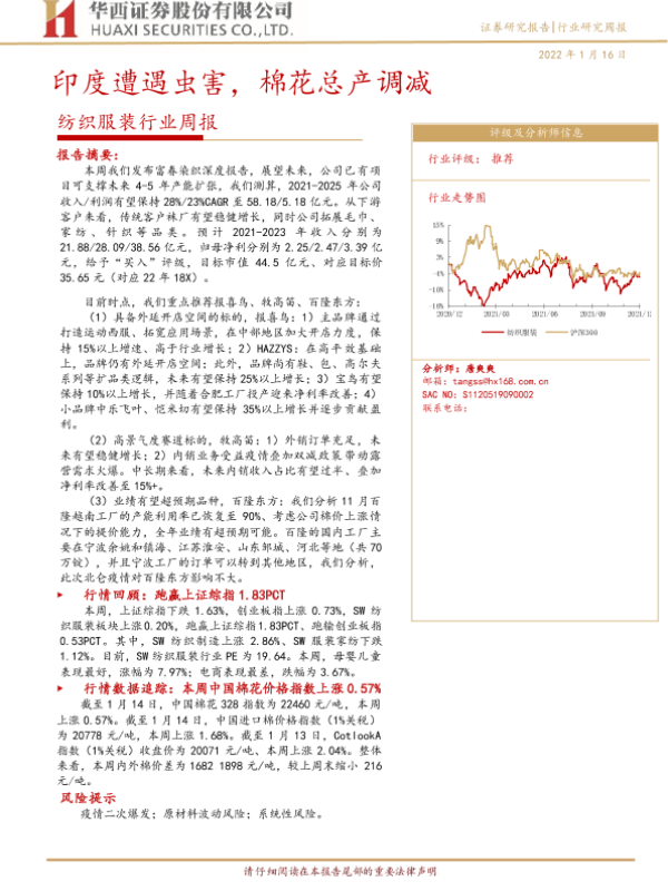 【华西证券】【20220116】20220116-华西证券-纺织服装行业周报:印度遭遇虫害,棉花总产调减-15页 行业研究