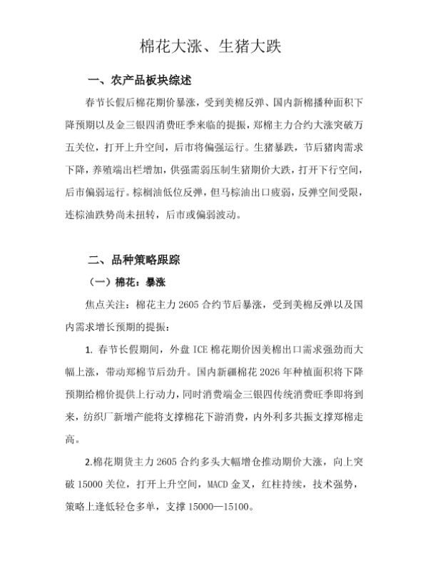 【天富期货有限公司】【202602】棉花大涨、生猪大跌-7页 证券期货研究报告