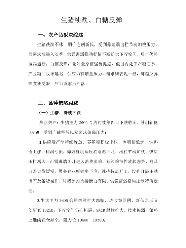 【天富期货有限公司】【202603】生猪续跌、白糖反弹-7页 证券期货研究报告