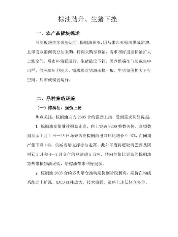 【天富期货有限公司】【202601】棕油劲升、生猪下挫-8页 证券期货研究报告