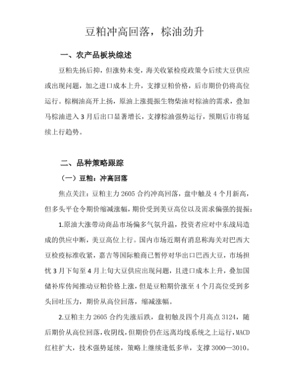 【天富期货有限公司】【202603】豆粕冲高回落,棕油劲升-7页 证券期货研究报告