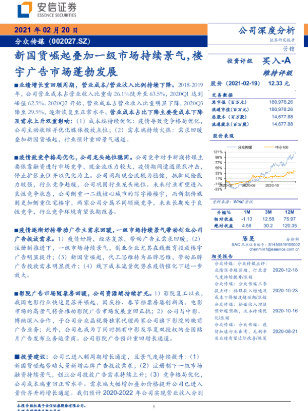 【新时代证券】【20210120】广告营销行业之楼宇广告跟踪专题二:20年受益经济复苏,21年品牌服务空间可期,持续推荐分众传媒-10页 行业研究
