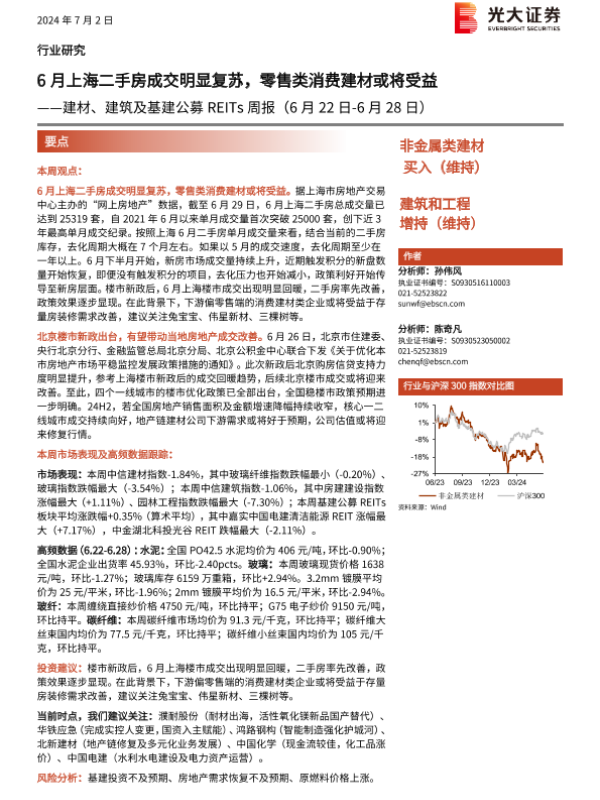 【光大证券】【20240702】建材、建筑及基建公募REITs周报:6月上海二手房成交明显复苏,零售类消费建材或将受益-17页 行业研究