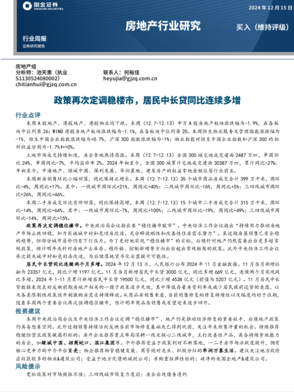 【国金证券】【20241215】房地产行业研究:政策再次定调稳楼市,居民中长贷同比连续多增-20页 行业研究