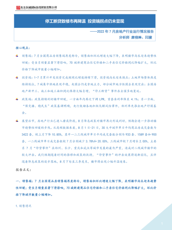 【东方金诚】【20220701】2022年7月房地产月报:停工断贷致楼市再降温 投资端拐点仍未显现-9页 行业研究