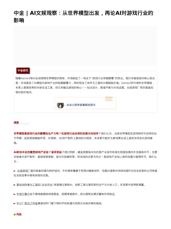 【中金公司】【202603】AI文娱观察:从世界模型出发,再论AI对游戏行业的影响-13页 证券期货研究报告