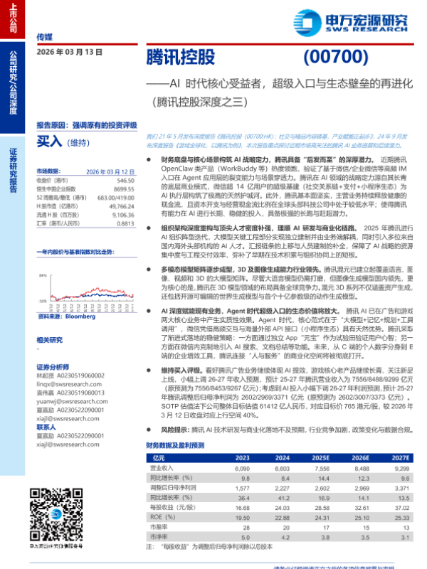【申万宏源】【202603】腾讯控股(0700.HK)AI时代核心受益者,超级入口与生态壁垒的再进化-31页 证券期货研究报告