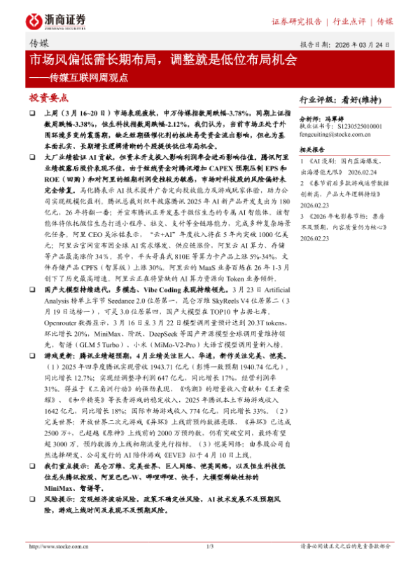 【浙商证券】【202603】市场风偏低需长期布局,调整就是低位布局机会——传媒互联网周观点-3页 证券期货研究报告
