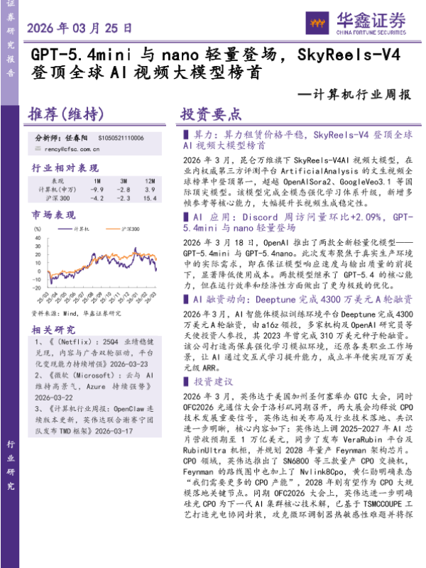 【华鑫证券】【202603】GPT-5.4m in i与 nano轻量登场, SkyRee ls-V4 登顶全球 A I视频大模型榜首-18页 证券期货研究报告