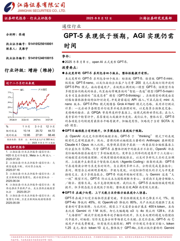 【江海证券】【20250812】通信行业_GPT-5表现低于预期_AGI实现仍需时间-4页 证券期货研究报告