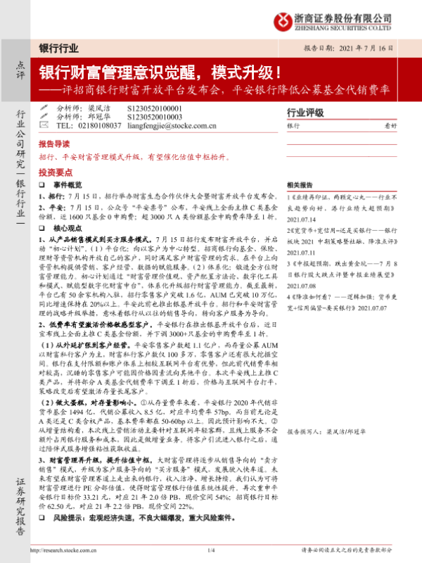 【浙商证券】【20210716】评招商银行财富开放平台发布会,平安银行降低公募基金代销费率-4页 行业研究