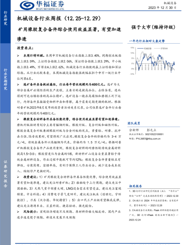 【华福证券】【20231230】20231230-华福证券-机械设备行业周报:矿用橡胶复合备件综合使用效益显著,有望加速渗透-15页 行业研究