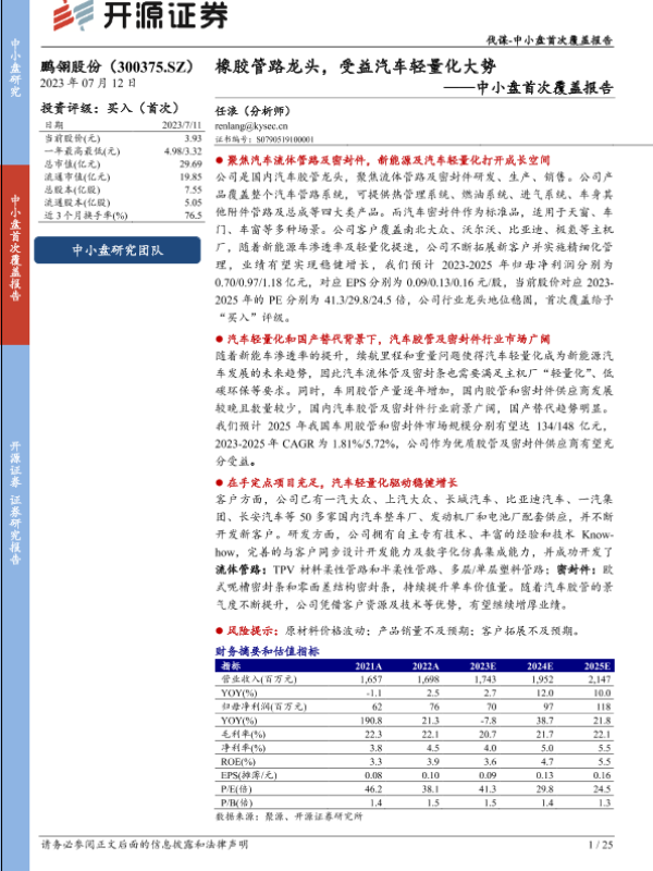 【开源证券】【20230712】20230712-开源证券-鹏翎股份-300375.SZ-中小盘首次覆盖报告:橡胶管路龙头,受益汽车轻量化大势-25页 行业研究