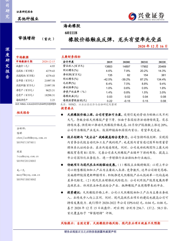 【兴业证券】【20201216】海南橡胶-601118.SH-橡胶价格触底快涨,龙头有望率先受益-30页 行业研究