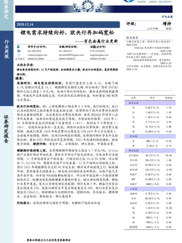 【国泰君安证券】【20201214】20201214-国泰君安-有色金属行业更新:锂电需求持续向好,欧央行再加码宽松-14页 行业研究