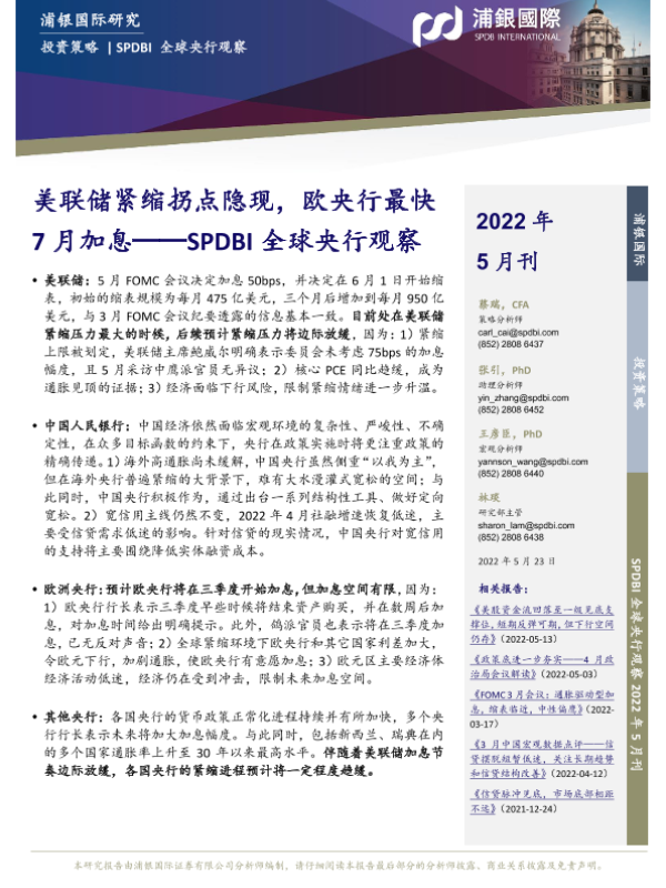 【浦银国际】【20220525】SPDBI全球央行观察:美联储紧缩拐点隐现,欧央行最快7月加息-35页 宏观策略