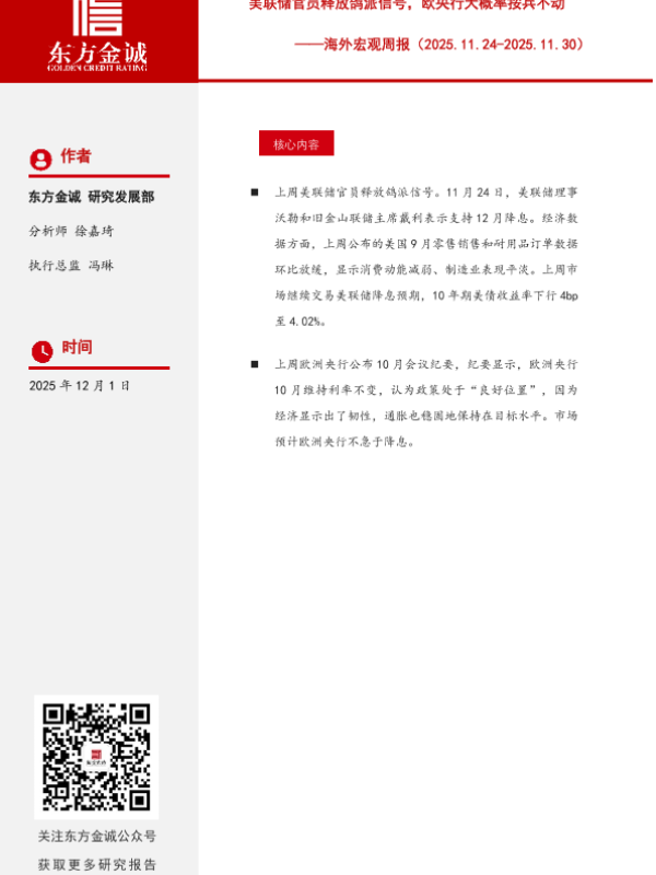【东方金诚】【202512】海外宏观周报:美联储官员释放鸽派信号,欧央行大概率按兵不动-9页 宏观策略
