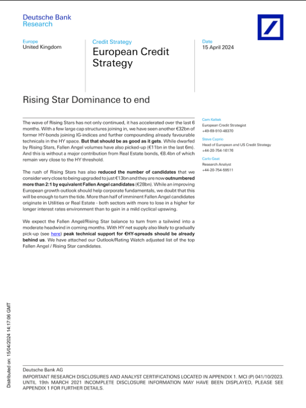 【Deutsche Bank AG】【20240415】Deutsche Bank-European Credit Strategy Rising Star Dominance to end-19页 行业研究