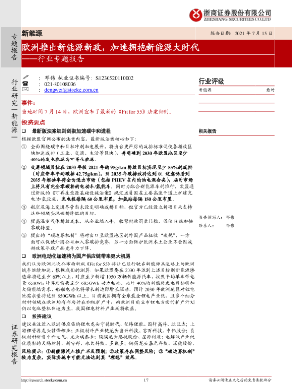 【浙商证券】【20210715】欧洲推出新能源新政,加速拥抱新能源大时代-7页 行业研究
