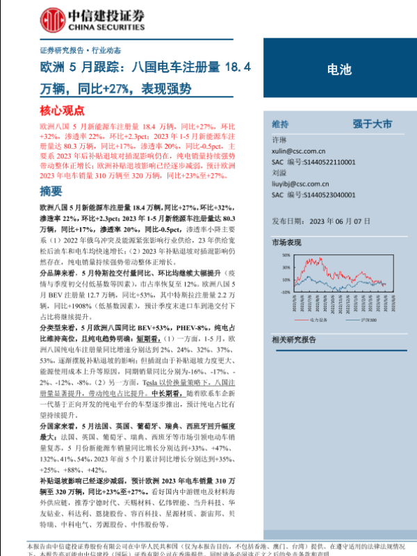 【中信建投证券】【20230607】电池行业欧洲5月跟踪:八国电车注册量18.4万辆,同比+27%,表现强势-22页 行业研究