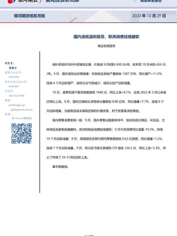 【银河期货】【20231029】纸浆月报:国内造纸温和复苏,欧洲消费延续疲软-107页 行业研究