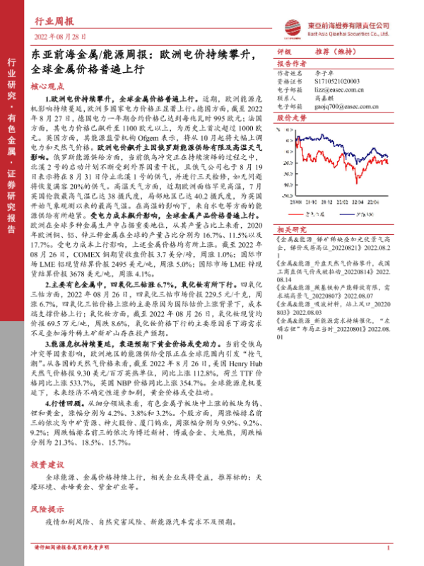 【东亚前海证券】【20220828】东亚前海证券-金属 能源周报:欧洲电价持续攀升,全球金属价格普遍上行-20页 行业研究