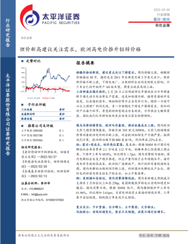 【太平洋证券】【20220305】20220305-太平洋-有色金属行业周报:锂价新高建议关注需求,欧洲高电价推升铝锌价格-16页 行业研究