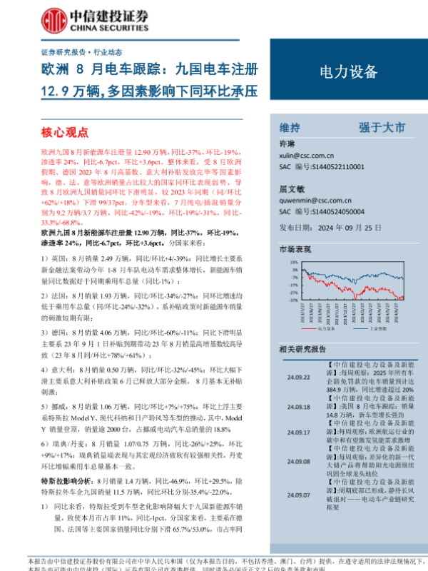 【中信建投证券】【20240925】电力设备行业欧洲8月电车跟踪:九国电车注册12.9万辆,多因素影响下同环比承压-24页 行业研究