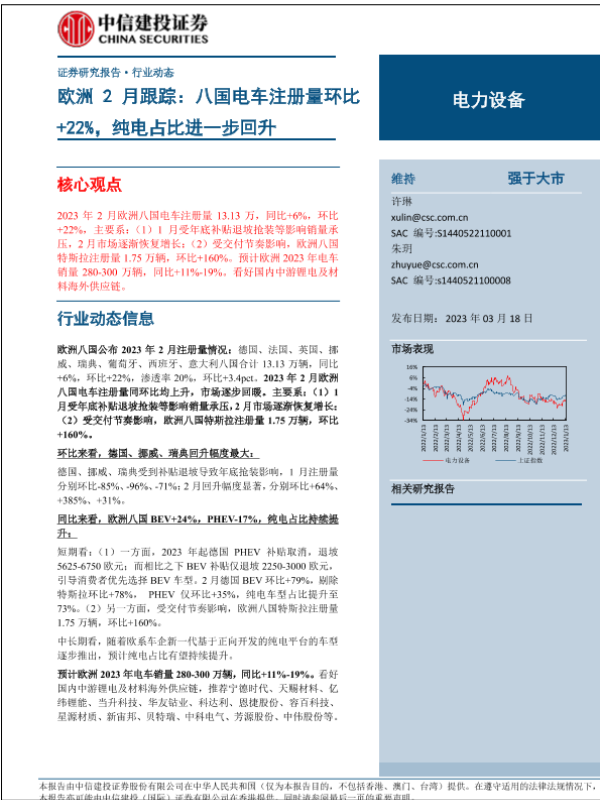 【中信建投证券】【20230318】电力设备行业欧洲2月跟踪:八国电车注册量环比+22%,纯电占比进一步回升-24页 行业研究