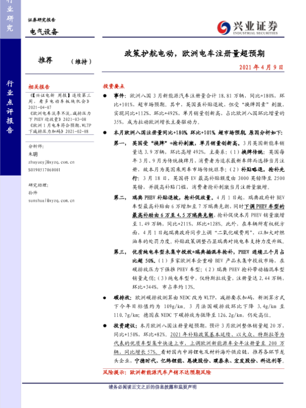 【兴业证券】【20210409】政策护航电动,欧洲电车注册量超预期-20页 行业研究