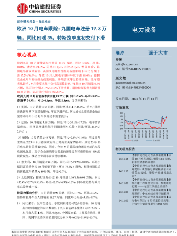 【中信建投证券】【20241114】2024年11月21日更新-【中信建投】电力设备行业欧洲10月电车跟踪:九国电车注册19.3万辆,同比回暖3%,特斯拉季度初交付下滑-25页 行业研究
