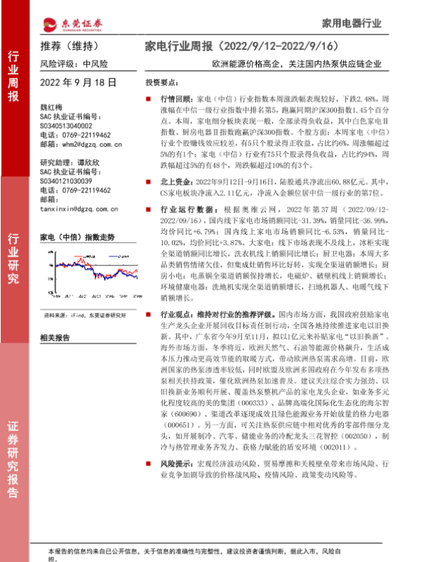 【东莞证券】【20220918】家电行业周报:欧洲能源价格高企,关注国内热泵供应链企业-16页 行业研究