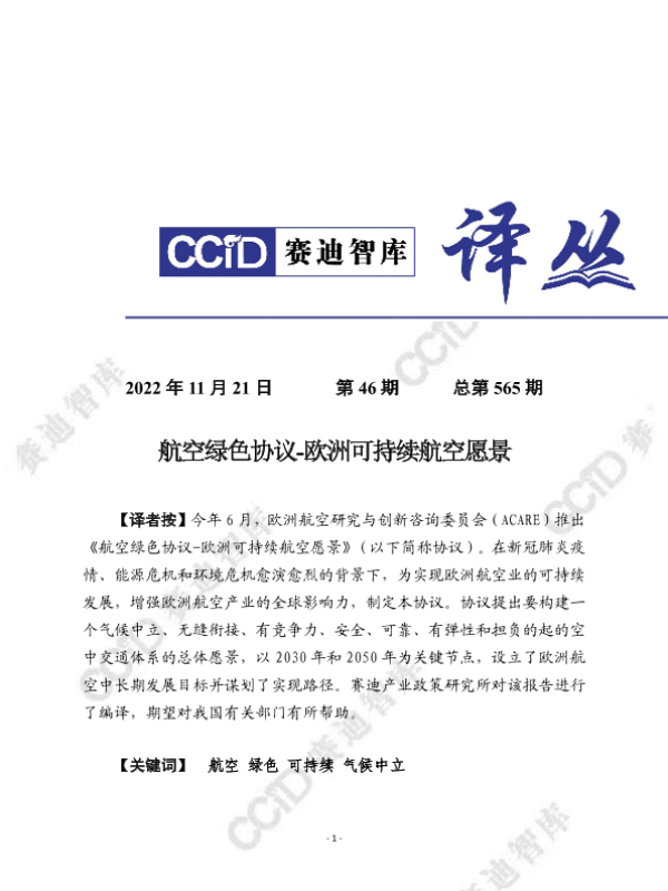 【欧洲航空研究与创新咨询委员会(ACARE)】【202206】航空绿色协议-欧洲可持续航空愿景-45页 行业研究