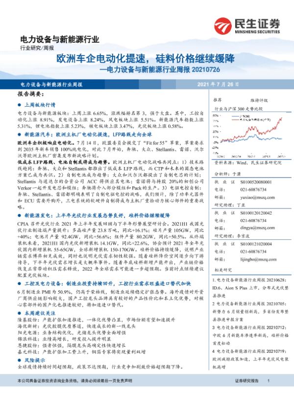 【民生证券】【20210726】电力设备与新能源行业周报:欧洲车企电动化提速,硅料价格继续缓降-20页 行业研究