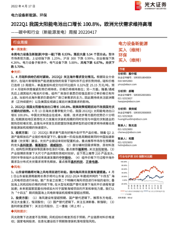 【光大证券】【20220417】2022Q1我国太阳能电池出口增长100.8%,欧洲光伏需求维持高增-9页 行业研究
