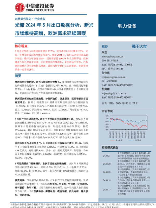 【中信建投证券】【20240627】电力设备行业光储2024年5月份出口数据分析:新兴市场维持高增,欧洲需求延续回暖-15页 行业研究