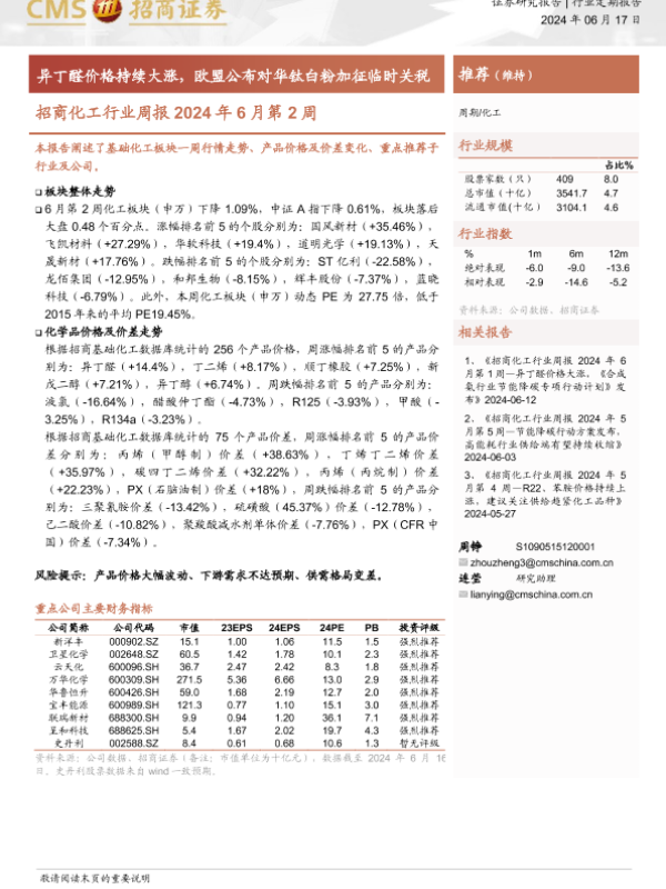 【海通证券】【20240617】招商化工行业周报2024年6月第2周:异丁醛价格持续大涨,欧盟公布对华钛白粉加征临时关税-25页 行业研究