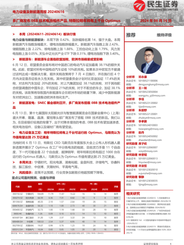 【民生证券】【20240616】电力设备及新能源周报:多厂商发布0BB技术电池组件产品,特斯拉明年将有上千台Optimus-24页 行业研究