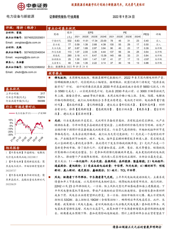【中泰证券】【20220924】电力设备与新能源行业周报:欧盟能源系统数字化计划助力新能源汽车,风光景气度依旧-29页 行业研究