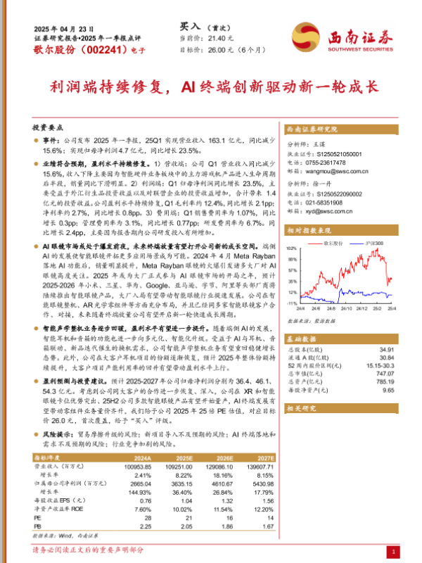 【西南证券】【20250423】歌尔股份2025年一季报点评-11页 证券期货研究报告